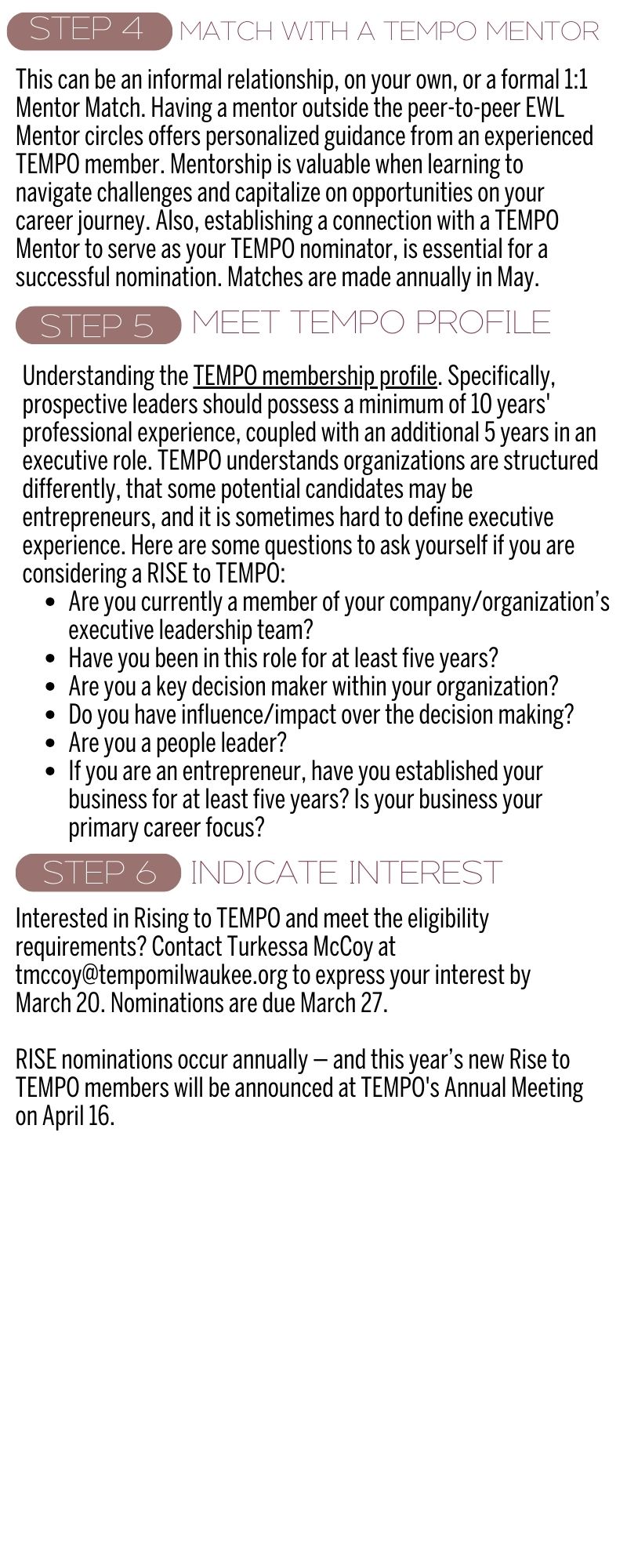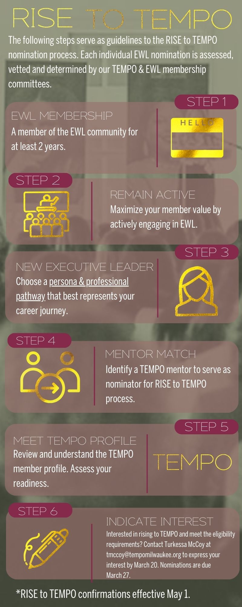 *Please note the following steps serve as guidelines to the RISE to TEMPO process. Each individual EWL nomination is assessed, vetted, and determined by our EWL and TEMPO membership committees.